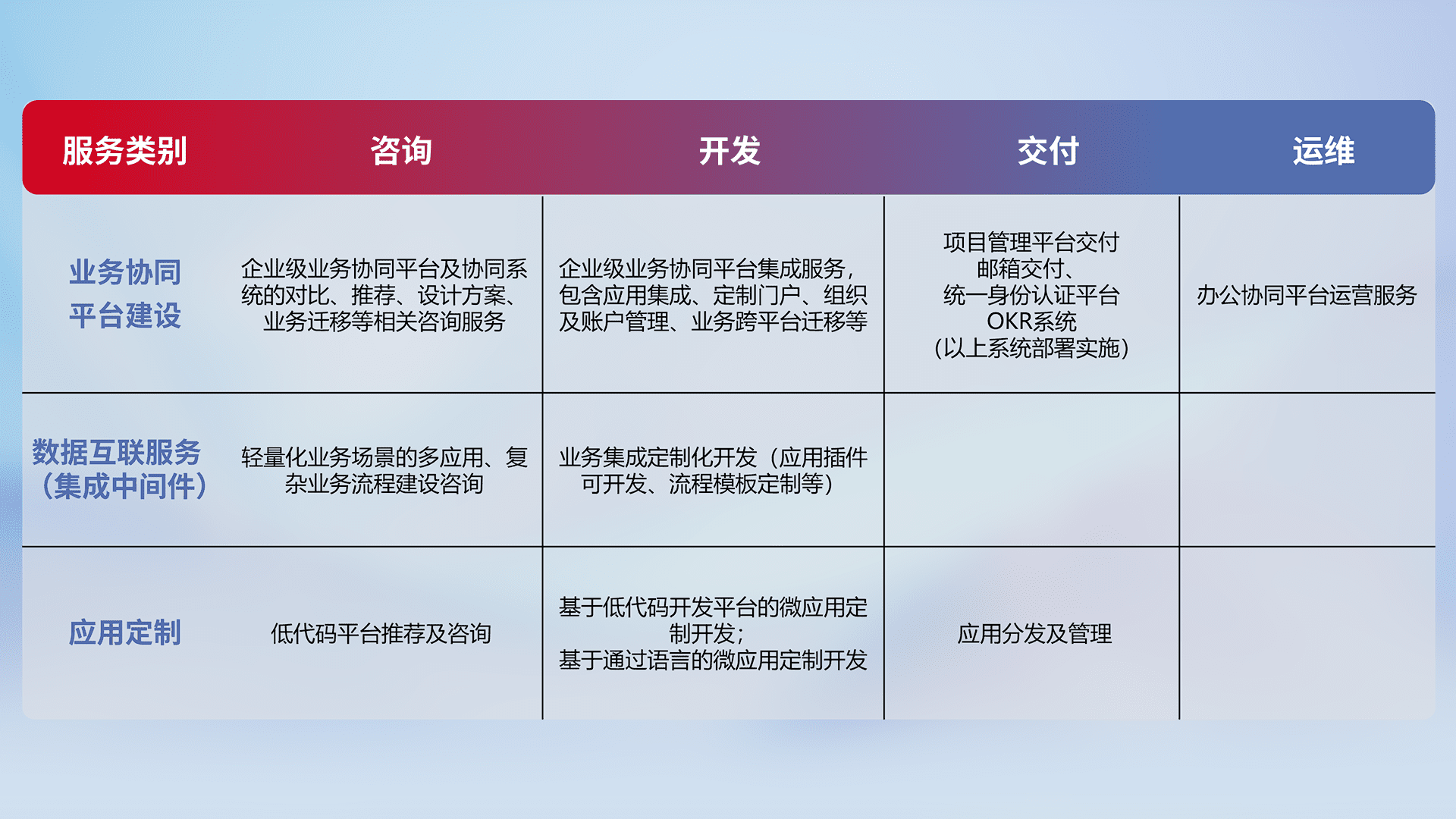 针对钉钉、、、企微、、、IDaas等平台级产品提供产品的规划、、、方案、、、、交付、、、定制化开发等服务,,实现如统一协同办公、、、、智能客户服务、、混合会议管理、、、、智能数据查询、、、、等业务场景,,,实现数字化转型。。。