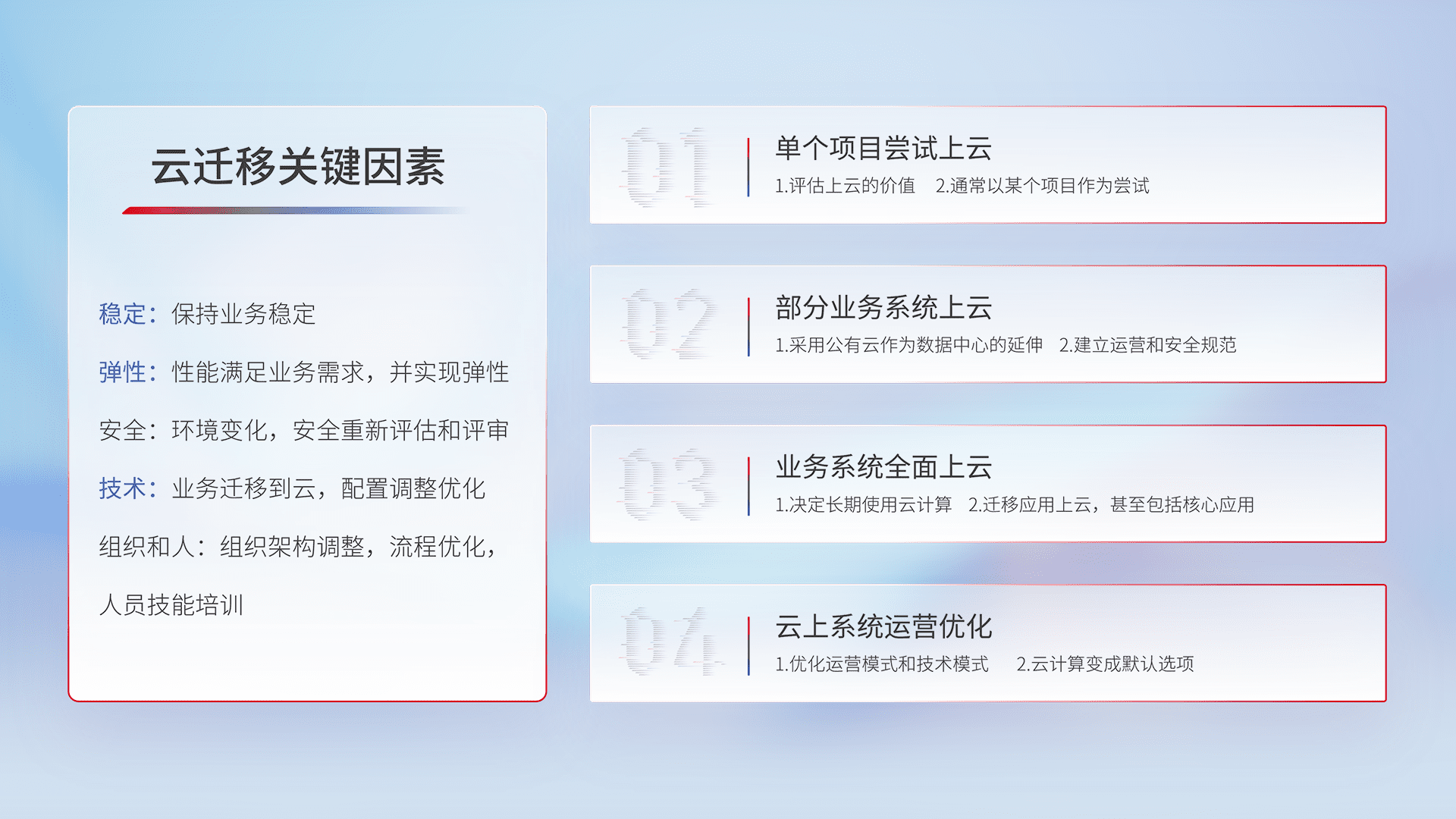 结合实际业务,,,从规划设计、、、云平台选型、、云原生改造、、、、数据迁移、、、集成交付,,迁移全过程为客户识别最佳上云路径,,,,做好风险识别管理,,设计网络架构、、、、身份权限、、、安全审计合规、、、、操作审计、、、、日志审计、、、、监控告警策略、、、多站点容灾设计等,,对云上基础设施进行整体规划,,,提升IT治理水平,,,以满足弹性、、高可用、、、高性能的需求。。