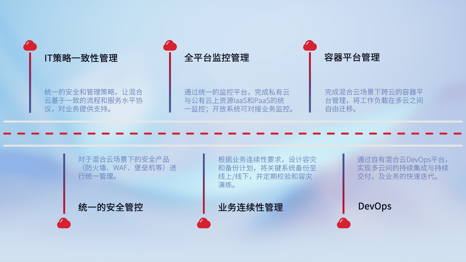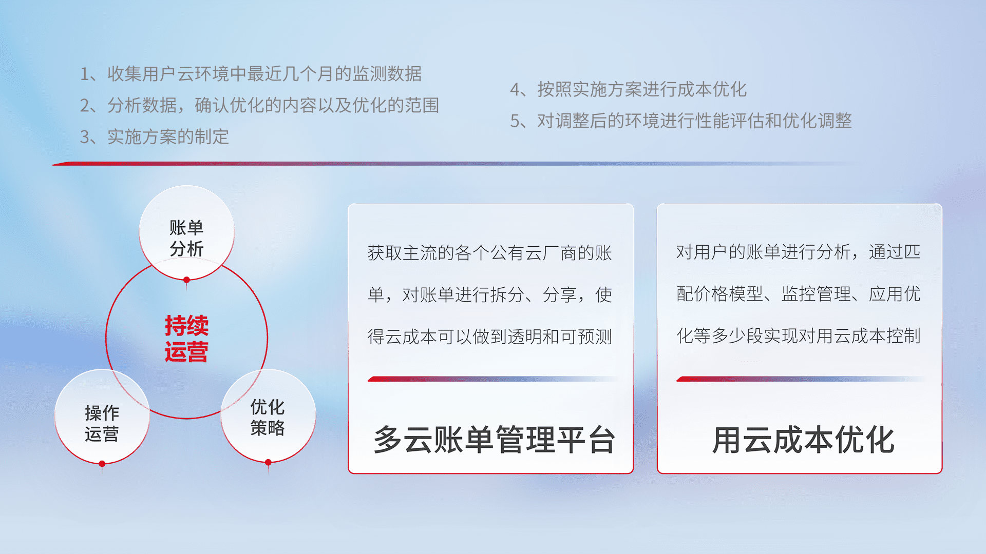 通过多云纳管,,以统一的资源数据模型把客户的云资源进行抽象和封装,,进而实现对多云资源的统一操作,,,,保障云资源管理的可靠性、、、、稳定性与可用性。。。量身定制化运维内容,,,配置、、、、开发运维、、、、补丁管理、、、备份、、监控、、、、认证和访问管理、、、、审计和日常巡检等,,,,保障在用云过程中的可靠度,,,稳定度以及高可用率。。。。